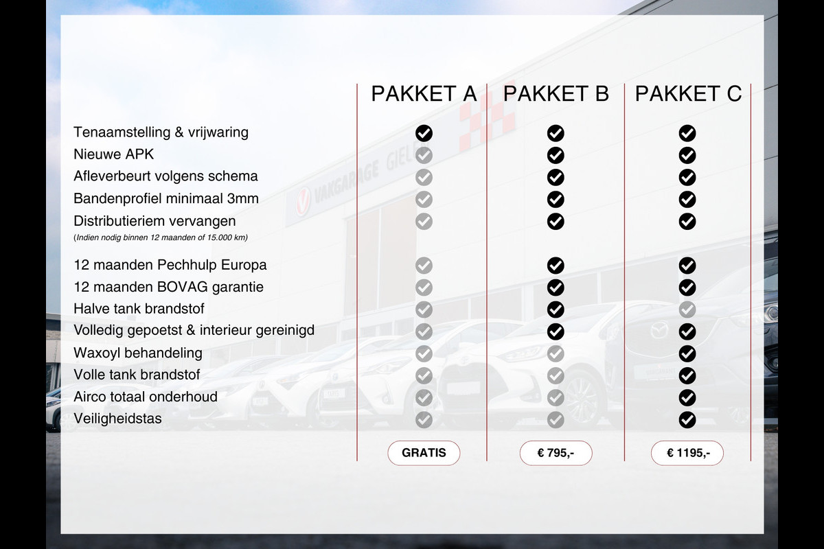 Onze auto's worden geadverteerd met standaard pakket A. Dit pakket omvat de tenaamstelling en een geldige APK. Optioneel kunt u kiezen voor afleverpakket B of C die zijn bijgevoegd bij de afbeeldingen.