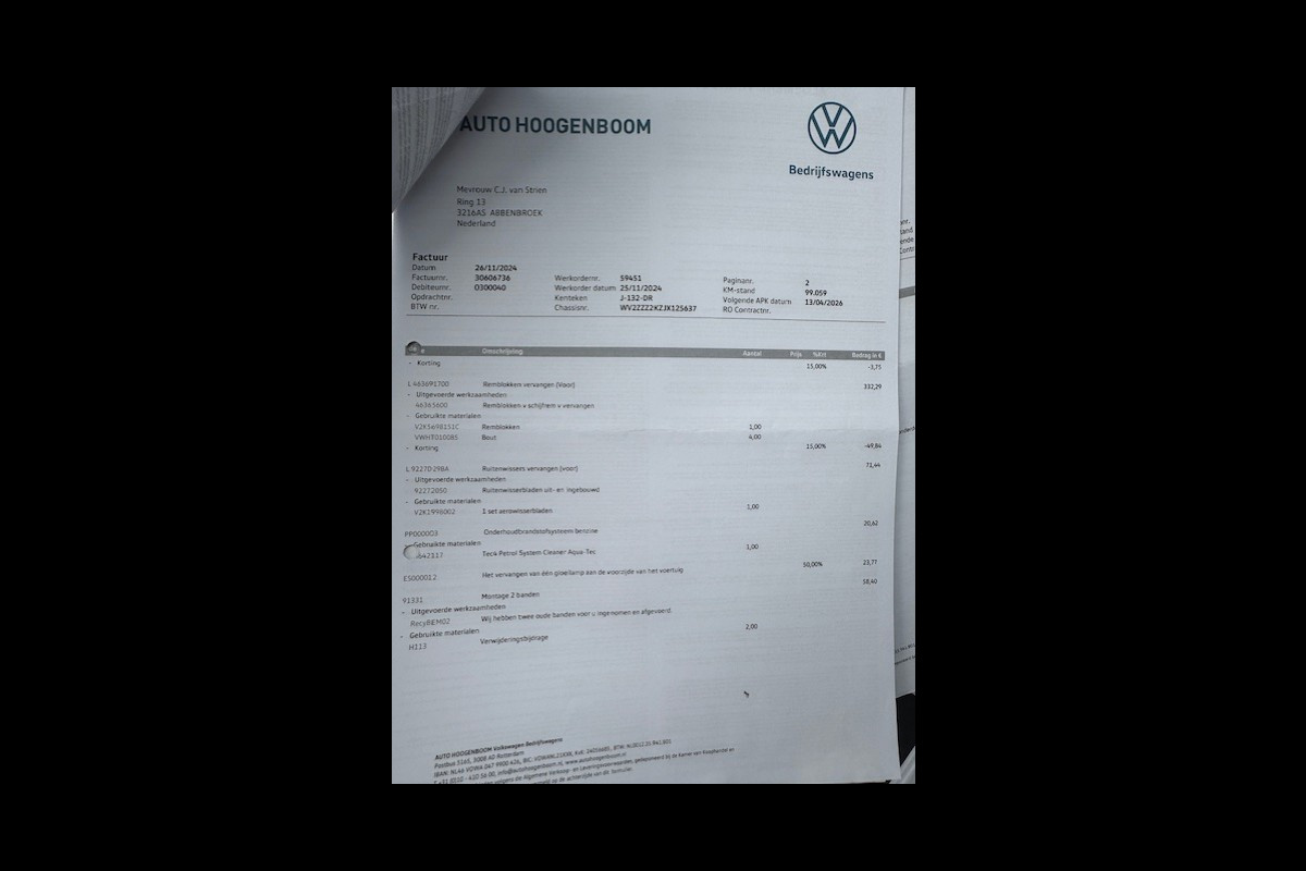 Grote beurt + Remblokken en schijven vervangen bij 99.059 km ( factuur aanwezig )