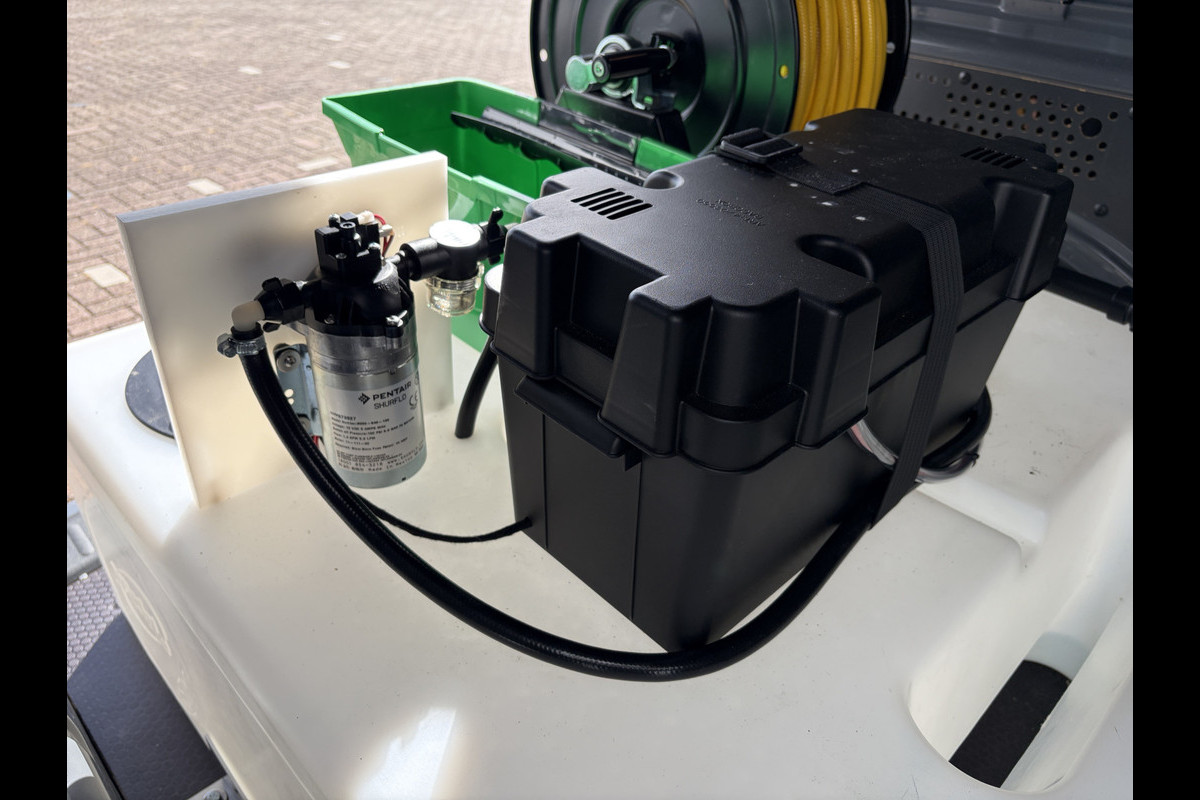 Compleet Telewash Systeem, gemakkelijk te plaatsen. Hoogwaardige PowerUP3D elektrische haspel, voorzien van 100 meter gewapende 8mm haspelslang. 100PSI pomp 5.3, filter, V16 varistreamer, 80ah greenline accu en accubak(gemonteerd)