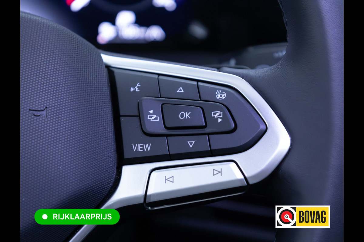 Met het digitale dashboard kunt u de cockpit-interface naar uw voorkeur instellen. Met de 360 graden camera kunt u elk obstakel of gevaar rondom de auto detecteren, wat uw veiligheid verhoogt. Adaptive cruise control houdt de ingestelde snelheid vast en houdt automatisch afstand tot uw voorligger. Kilometerstand? Oliepeil? Accuspanning? Allemaal te zien via de app. Overal. Altijd. Dankzij Connected Services. Uw veiligheid op de weg wordt verhoogd door het audio-installatiesysteem met DAB-ontvangst en het navigatiesysteem te bedienen vanaf het stuur of met spraakbediening, zodat uw handen veilig op het stuur blijven en uw ogen gericht zijn op de weg. De uitrusting van deze Volkswagen is met kruisend verkeer detectie, automatische airconditioning, draadloos opladen, regensensor, automatisch dimmende binnenspiegel en lederen stuur behoorlijk compleet.