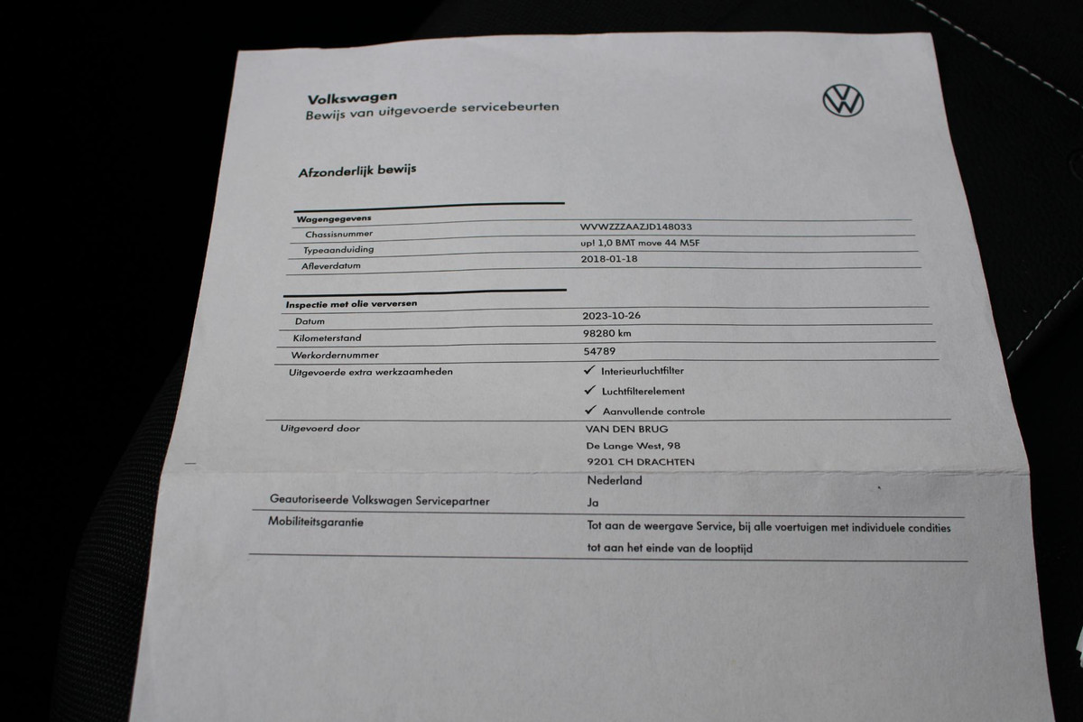 Dit is een auto die is ontworpen voor uw comfort. Deze Volkswagen Up! van het bouwjaar 2018 heeft 103208 kilometer op de teller staan. Niet voor niets is de vraag naar gebruikte Volkswagens zo groot, want de kwaliteit staat ook na een aantal jaren nog buiten kijf, zoals aan deze Up! duidelijk te zien is. Met zijn pittige benzinemotor stuurt u deze auto gemakkelijk en vlot door het verkeer. Natuurlijk behoren warmtewerend glas, LED-dagrijverlichting, in delen neerklapbare achterbank en snelheidsafhankelijke stuurbekrachtiging ook tot de uitrusting van deze complete auto.